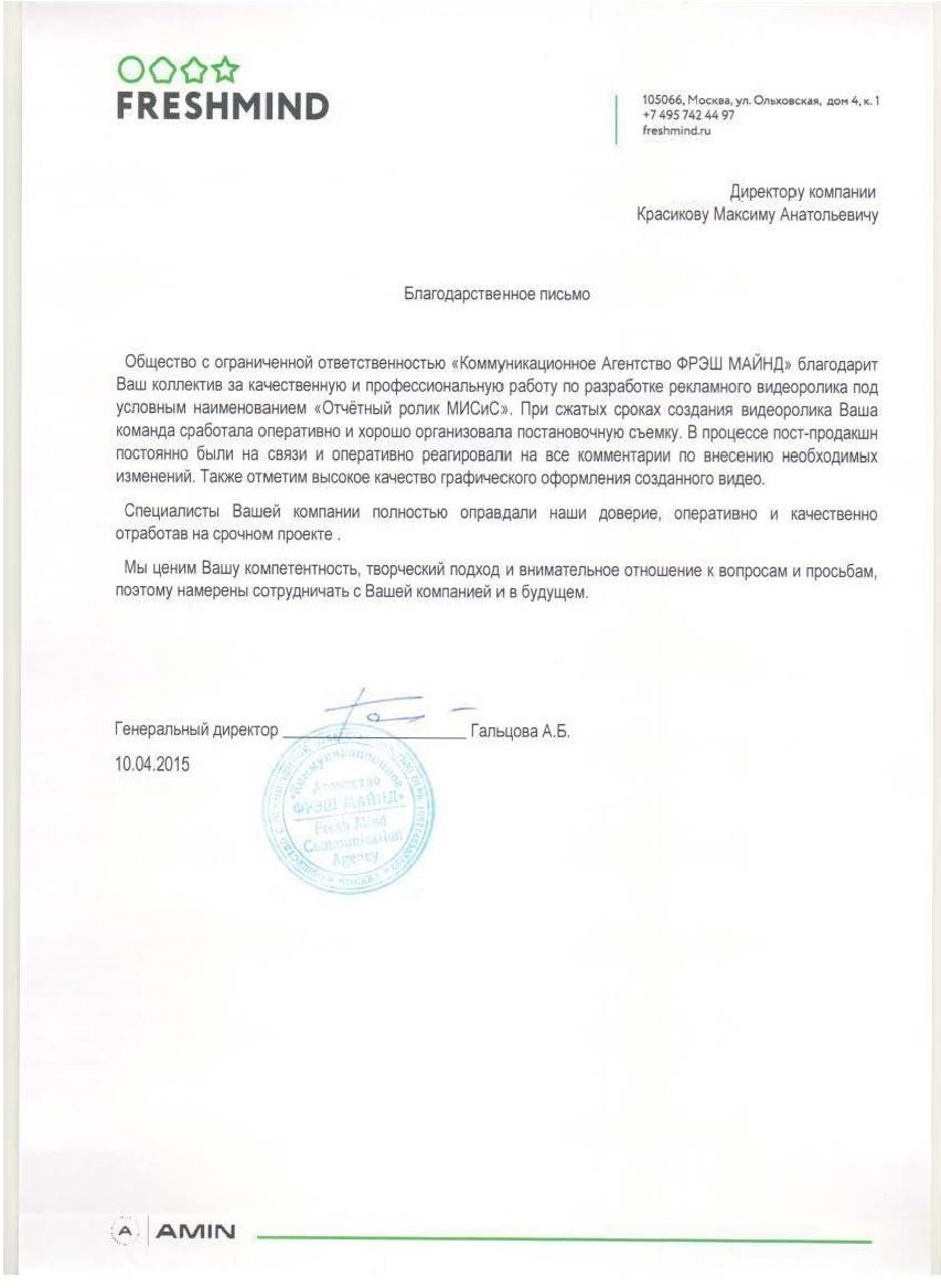Благодарим Ваш коллектив за качественную и профессиональную работу по разработке рекламного видеоролика. При сжатых сроках Ваша команда сработала оперативно и ...